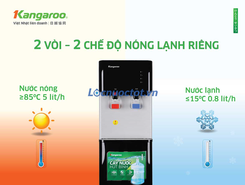 Cây nước nóng lạnh Kangaroo KG57A3 với 2 vòi 2 chế độ nước Nóng/Lạnh sẽ phục vụ đa dạng nhu cầu giải khát, chế biến, nấu nướng tại gia đình, văn phòng hay công xưởng... Hệ thống làm lạnh bằng chíp tuy chỉ giúp nước lạnh nhẹ nhưng vừa đủ để giải khát, bảo vệ cổ họng cũng như tiết kiệm điện tối ưu hơn.