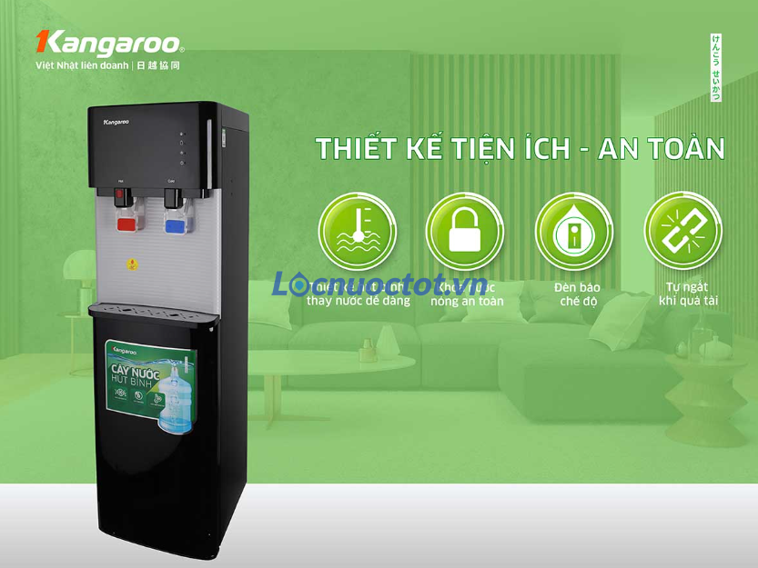 Máy làm nóng lạnh nước uống Kangaroo KG57A3 có thiết kế màu đen kết hợp màu trắng sữa phù hợp đặt hầu hết mọi không gian trong căn nhà của bạn.