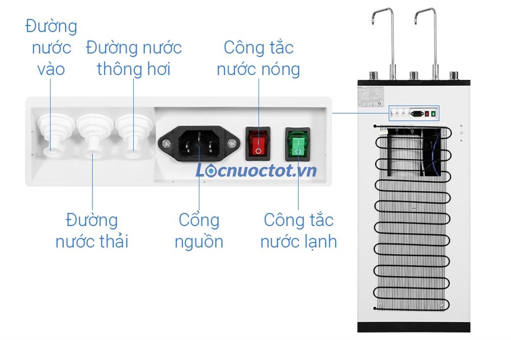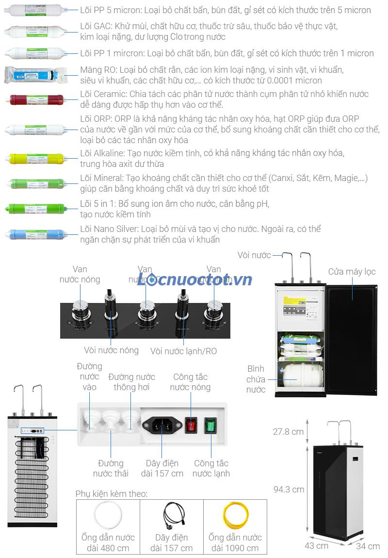 | Tiện ích | - Bơm hút sâu 3m - Tạo nước tinh khiết, cân bằng Axit bù nước bù khoáng cho cơ thể - Công nghệ làm lạnh bằng Block (lạnh sâu) - Ngừng hoạt động khi áp lược nước thấp - Tự động xả nước thải - Ngừng hoạt động khi nước đầy bình |