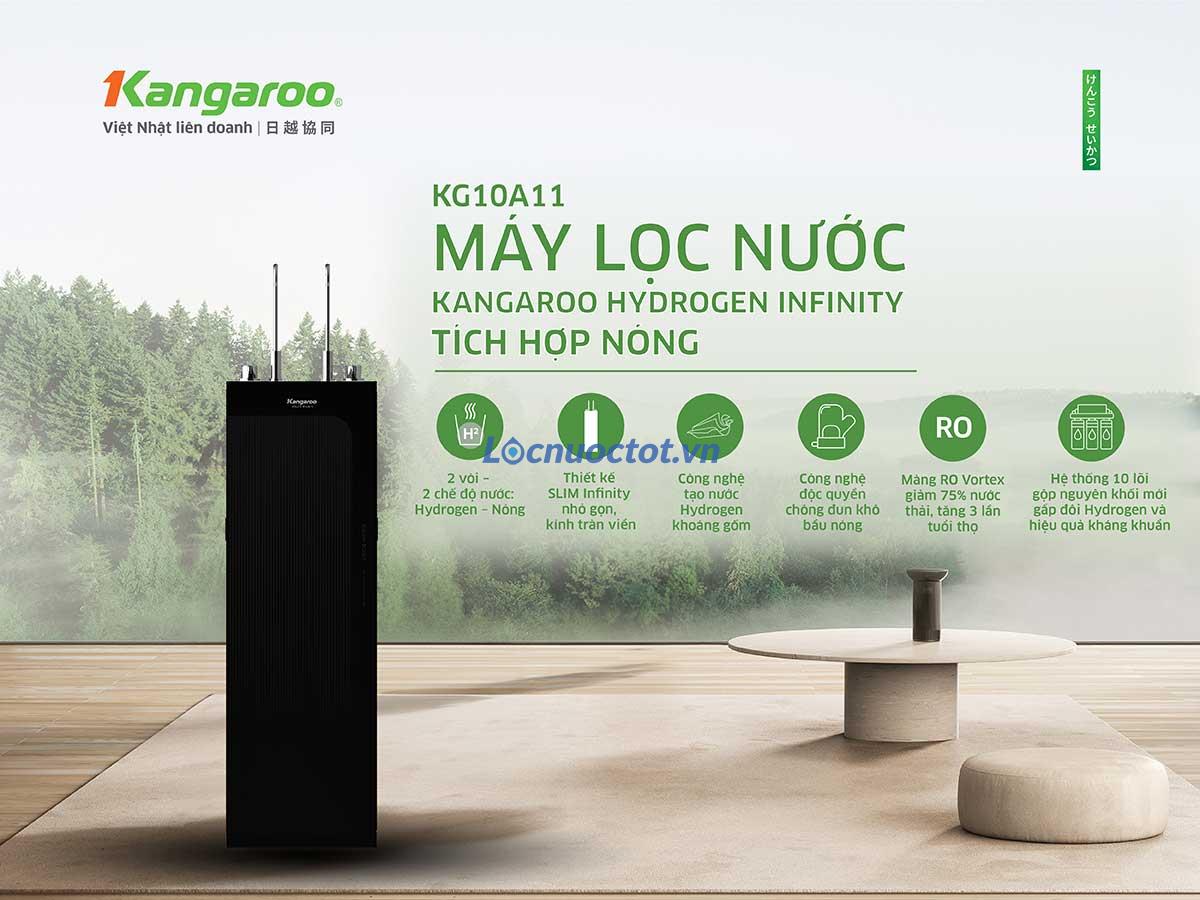 Máy lọc nước tích hợp nóng Kangaroo Hydrogen KG10A11 nổi bật với cụm lõi gộp nguyên khối hoàn toàn mới cho tốc độ nước ra vòi nhanh, gấp đôi Hydrogen và hiệu quả kháng khuẩn vượt trội. KG10A11 có thiết kế nhỏ gọn, kính tràn viền sang trọng, 2 chế độ nước nóng – nước RO, cùng hệ thống 10 lõi lọc mạnh mẽ.