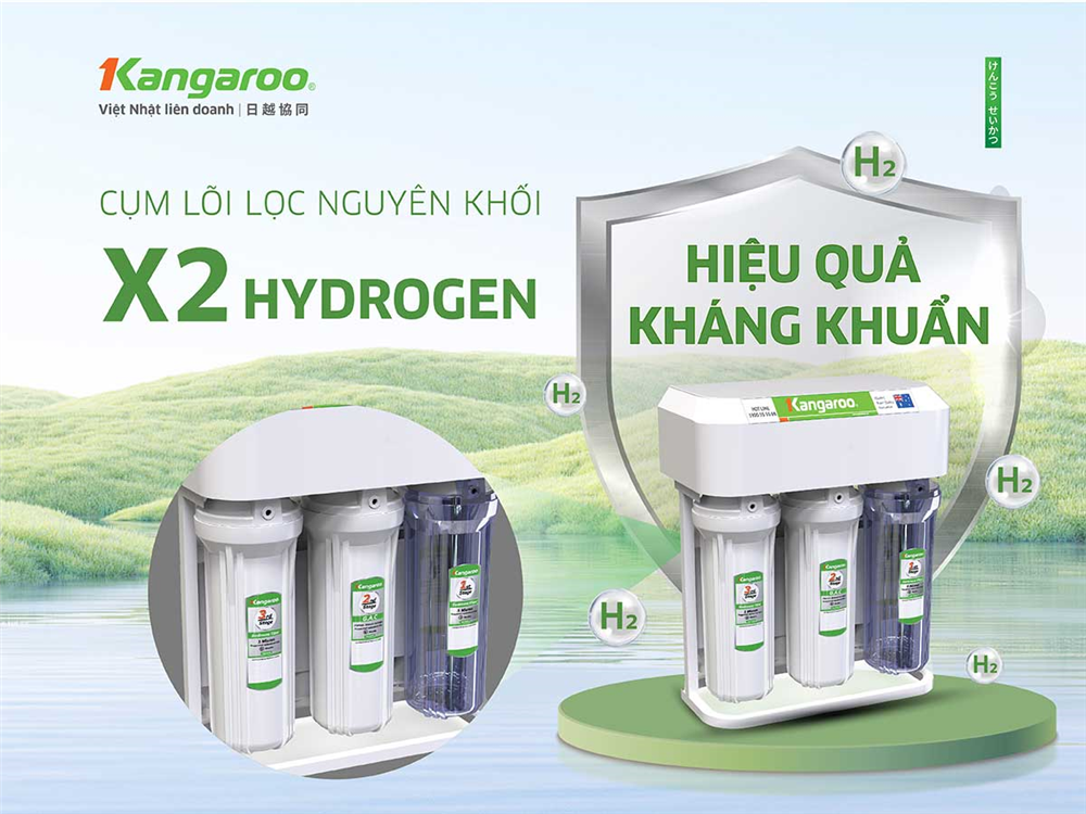 Duy nhất Kangaroo có bằng sáng chế độc quyền thiết bị lọc nước Hydrogen. Nước Hydrogen bổ sung vi khoáng tự nhiên và chất điện giải có lợi, giúp tăng cường miễn dịch và nước có vị ngon tự nhiên. Đồng thời hoạt động như một chất chống oxy giúp loại bỏ gốc tự do có hại gây lão hóa, các bệnh dạ dày…