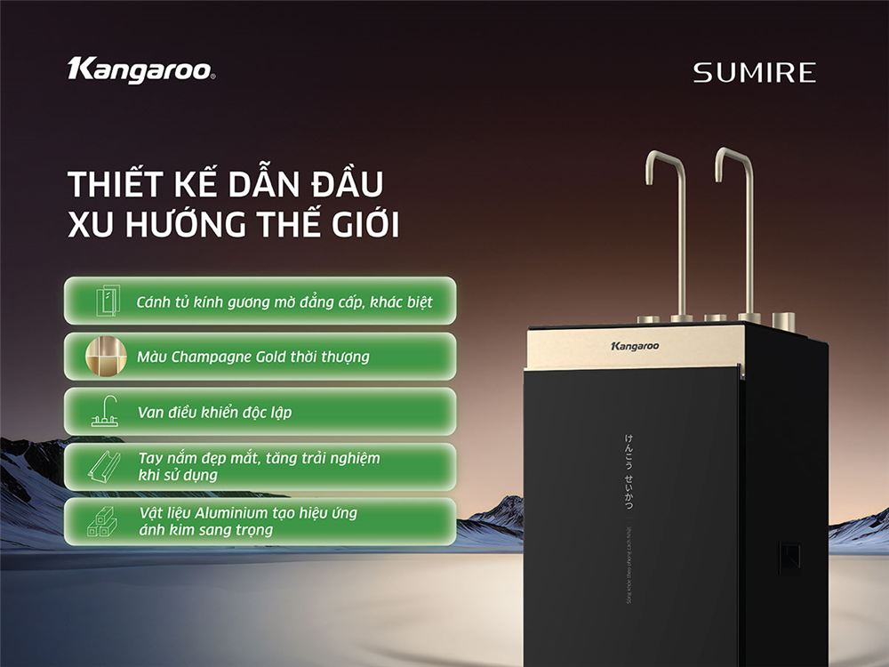 Máy lọc nước ion kiềm Kangaroo KGHC13A3 sở hữu thiết kế loại bỏ bo viền sang trọng, kết hợp cùng vật liệu kính gương mờ đẳng cấp. Tay nắm vật liệu Aluminum tạo hiệu ứng ánh kim đẹp mắt, tăng trải nghiệm khi sử dụng. Màu Champagne Gold dẫn đầu xu hướng nội thất hiện nay (sản phẩm có ánh kim nên màu sắc có thể thay đổi tùy thuộc vào ánh sáng môi trường).