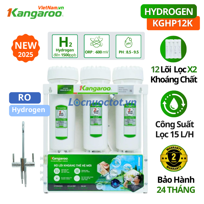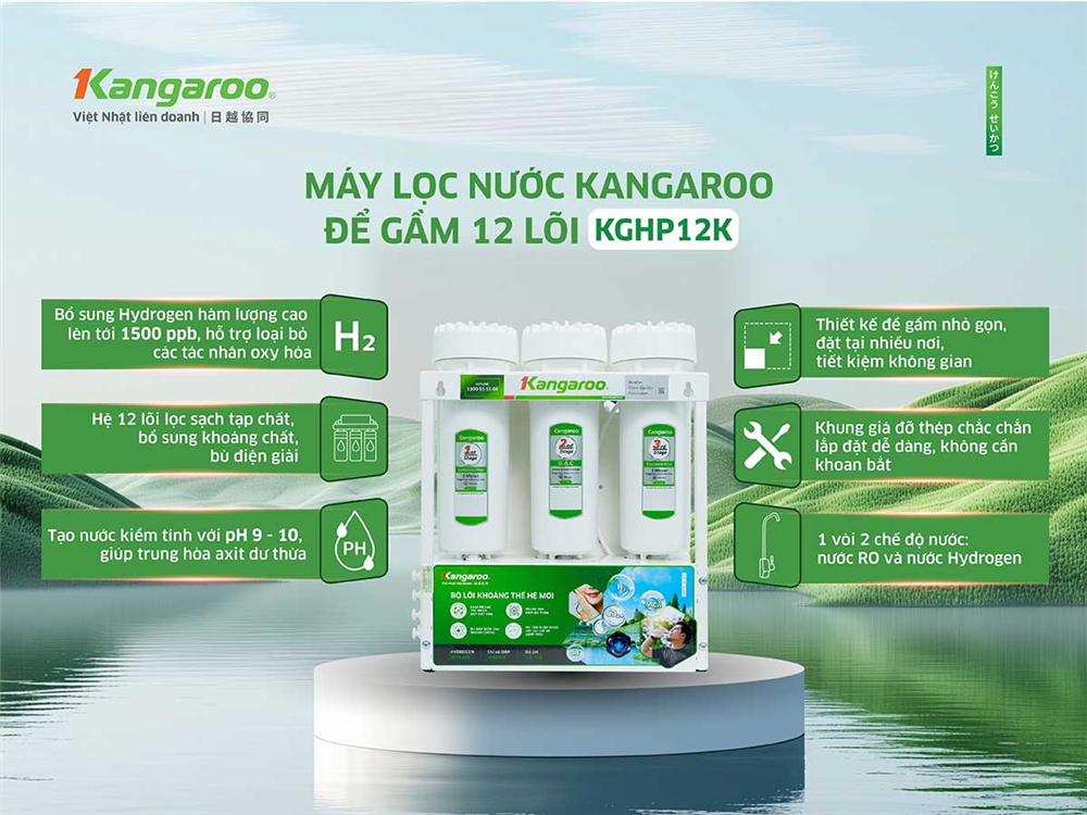 Máy lọc nước Hydrogen Kangaroo KGHP12K có thiết kế gọn nhẹ, là dòng máy để gầm duy nhất cung cấp 2 chế độ nước: nước Hydrogen – nước RO. Với 12 lõi lọc mạnh mẽ, KGHP12K tạo nước khỏe có độ kiềm pH 9 – 10, giúp trung hòa axit dư thừa và loại bỏ các tác nhân oxy hóa nhờ hàm lượng Hydrogen cao.