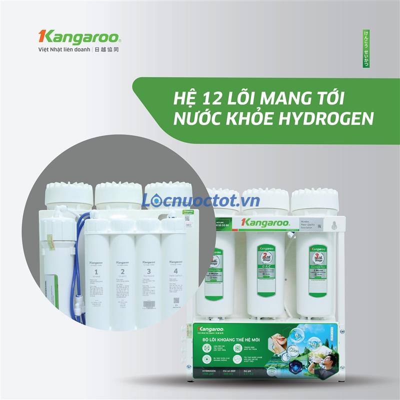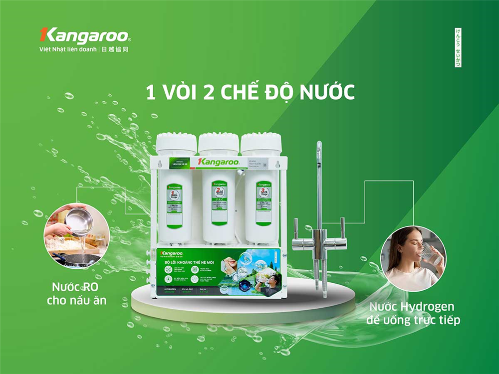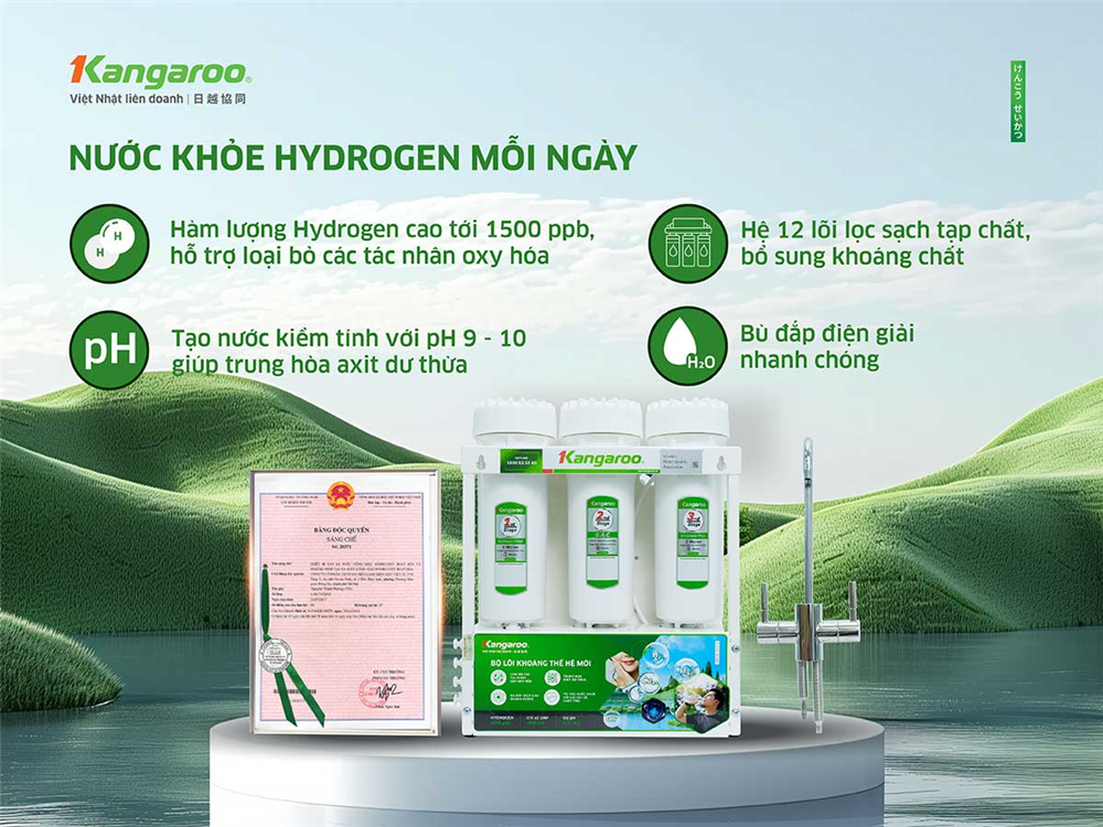 Duy nhất Kangaroo có bằng sáng chế độc quyền thiết bị lọc nước Hydrogen. Nước Hydrogen bổ sung vi khoáng tự nhiên và chất điện giải có lợi, giúp tăng cường miễn dịch và nước có vị ngon tự nhiên. Đồng thời hoạt động như một chất chống oxy giúp loại bỏ gốc tự do có hại gây lão hóa, các bệnh dạ dày…
