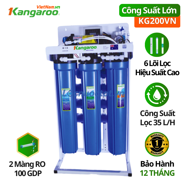 Máy lọc nước Kangaroo KG200VN - Công suất 35 Lít/giờ KG200VN đáp ứng nhu cầu lấy nước cho từ 10-50 người, chuyên dùng cho gia đình, văn phòng công ty mang đến nguồn nước sạch, tiện lợi, an toàn. Cấu tạo nhỏ gọn, thuận tiện cho lắp đặt