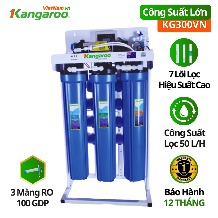 Khác với dòng máy lọc nước gia đình thông thường, Máy lọc nước Kangaroo RO - Công suất 50 Lít/giờ KG300VN có 3 màng RO Vortex 100GDP (Made in Korea), công suất lọc lớn 50L/h.
